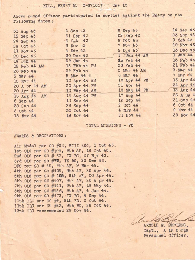 | Henry M. Hill, was a B-26 Marauder Man from Memphis TN. He flew over Continental Europe - 72 missions. He was in the 9th Air Force, 387th Bomb Group, 559th Bomb Squadron. He received the Air Medal (four oak leaf clusters) and two Distinguished Flying Crosses. His basic training was in Enid Oklahoma and graduated from the Lubbock Army Flying School- Class 43-A on 1-14-43. Date of separation 6-29-45. He passed away July,1996. |