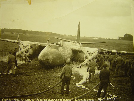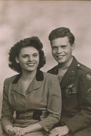 | Burton Lee Vreeland Technical Sergeant, Radio operator/ Waist Gunner 386th Bomb Group 552nd Bomb Squadron 53 Missions from March 1944 to January 1945 Training at MacDill Field, Fla. & Lake Charles, La Lake Charles AAB Great Dunmow, England March 1944 Beaumont-sur-Oise, France Oct 1944 Aircraft: 41-35247 Martin B-26C-25-MO Marauder 135247 RG-Z named "Carefree Carolyn" on the right nose, and "Spirit of Pansy Yokum" on the left nose placed by the Ground crew after their recently lost plane, "Pansy Yokum" 131638 RG-N, on Jan. 14th 1944. They had been reassigned to Carefree Carolyn. Great Dunmow, England Mar 1944 Air Offensive, Europe Normandy June 6, 7, 8 1944 Northern France Beaumont-sur-Oise, France Oct 1944 Rhineland Ardennes-Alsace 4 kills 2 confirmed 2 probable Me 109G spiral spinner FW 190D FW 190A Me 109E Yellow nose Born on the Southside of Chicago, ILL. May 2nd 1921 and grew up loving airplanes and building models. Later I became interested in Architecture and started going to Architecture School getting up early in the morning to get to class. On occasion, I would cross the Rail Road tracks, in the snow, just in front of an on coming train to get to the station in time, as I would sometimes be running late. Little did I know that a Gorgeous brunette had been watching me and noticed my scurrying across the tracks with my books & coffee in hand and was thinking, "What a Nut". But that nut and the gorgeous Brunette later had a date and we eventually fell in love. I decided to Enlist as the War was ramping up and the call for men was prevalent. At the same time, Doris, the gorgeous brunette and I made plans to marry. I started my training at MacDill Field, Fla, "One a Day in Tampa Bay", Yeah, that place. We were one of the First crews from our class to Crash Land a ship. Due to an organizational foul-up between the trainee pilot and the trainer while practicing shutting off engines in flight, the trainee shut off the left engine while the trainer shut off the right and since we were flying on the deck at the time, the ship went down Like a Rock on her belly. No one was injured. We were ordered to Lake Charles, LA so I went back home on leave and married Doris the day after Christmas. We moved to Lake Charles, LA and I completed my training. We were assigned a plane to fly over to the ETO, a brand new B-26F all Silver aluminum and we were going to name it 'HOT ROCK' when we got to England. We took the Southern route, South America to Africa where we had to stop because the right engine threw a rod and we had to wait for parts. I was stuck there for 2 weeks and All we had to eat was Vienna Sausages and water. To this day I can't look a Vienna Sausage in the face. As soon as we landed at Great Dunmow our plane was pulled away for another crew to use, as they had lost their plane just days before. That was the last we saw of 'Hot Rock' as it took a direct 155mm flak round to the left engine on that mission, never to be seen again. It was a Beautiful plane! I completed my Radio Operater training after arriving at Great Dunmow and was working on the radio, trying to get my work done in a hurry because Ike was at the base. I was able to meet the Great Man in person, April 1944. We were assigned our plane "Carefree Carolyn" a B-26C with "Spirit of Pansy Yokum" on the left side of the nose, named by the ground crew who lost their plane "Pansy Yokum" earlier. We went out on mission after mission and I got my first confirmed. An Me 109G with a Spiral painted spinner. I must have hit his tanks as the Me 109G blew apart. D-Day,,June 6th was exciting. Special codes on the Radio and No Luftwaffe. We took off in the early morning and afternoon and Laid waste the coastal guns at Houlgate. I remember D-Day as being the first mission Lt. Slanker flew as our Official pilot. We were together from then on. June 15, 1944 our hydraulics were shot out and we had taken hits from 88 & 155mm Flak, so we brought her in on her belly at Great Dunmow. Lt. Earl Slanker brought her in just as smooth as it could be. A Great pilot! The bottom of the plane ripped out as we skidded to a stop and I could see the ground come to a stop directly below me. The B26.com's historian Chester Klier has recorded the Official reported story in his mission 209 but the Truth in that report was, I was hit by Flak in the hand and was bleeding. The piece of flak, about 1 cm square, fell out of my glove as I stood up after coming out of the plane. I still have it! They took me to the hospital, where they patched me up and I was fine. I was asked if I wanted a Purple Heart and I said "no, it's not that bad of a wound." Little did I know, Lieutenant Solon Humle had slipped on the fire retardant foam, sprayed on the engines & wing as he ran down the wing span to escape the plane and injured his elbow as he slipped on the wing. When he heard I had turned down my Purple Heart, well, 209 is the Official report. We flew different Marauders after we lost Carefree Carolyn and never had a plane of our own after that. The ETO had increased in intensity and the missions were two a day, sometimes three. The Flak had become dense 88 and 155mm bursts on every mission, so thick, it looked like you could get out and walk on it. I started to get Flak happy. On one of these missions I remember our crew being assigned a plane and jumping on board to set up my waist gun position when, Another waist gunner jumped aboard and told me He had been assigned to this plane and only He was going to man the waist guns. I, not wanting a confrontation at the time, agreed to man the turret guns and I'm glad I did. In the course of our mission the waist gunner took a 20mm flak round in the stomach and it split him open from neck to groin. We placed wet rags across his body to hold him together till we returned to Great Dunmow. He survived! Coming back from another mission we had Large Cumulus clouds and as we flew out of one cloud, an FW-190D sat right next to our plane as