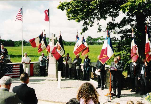 Dedication Ceremony Magneville, France 5th June 2003. The ceremony commenced from the centre of the village of Magneville at 1030am when the local brass band headed the procession of French schoolchildren, local dignitaries together with a delegation of paratrooper veterans supervised by Commander Lou Horn from the 507th PIR from the 507th PIR, also present was Lieutenant Colonel Crosby the military attaché to the American Embassy followed by approx 200 local people. They proceeded to the memorial which is situated about 200yds away. On arrival at the memorial the Mayor of Magneville, Mr. Maurice Duchemin, began his speech. He thanked everyone for attending and recalled the historical background of the tragedies, the loss of the C47 on D-Day and the B26 Marauder on the 10th June 1944. He stated it was every ones duty to remember that they, the French people, must never forget the sacrifices made by these men. His speech was translated for the benefit of the non French speaking people attending. The mayor then invited Col. Crosby and Comm. Lou Horn to unveil the plaque honouring the B26 crew, the plaque was covered with both the American and French Flags, they did the American flag, and the mayor took the French Flag. A wreath was laid at the memorial followed by the placing flowers at the base of the cross by the schoolchildren and various dignitaries. At this point the children began to read the names of each of the victims of the two tragedies, each child reading out a name and after each name the said "Mort pour la France" (died for France) this is a very emotional moment in the ceremony. After all the names had been called the children read two poems in French "Le dormeur du Val" by Raimbaud and "Liberte" by Paul Eluard. Hymns were played by the band. Commander Lou Horn and one of the veterans then said a few words. At the end of the ceremony the band played the American national anthem followed by the French national anthem. Mr. Duchemin ended the ceremony by once again thanking all the people for attending. 60th Anniversary Ceremony 4th June 2004. It was an honour for me to be able to take part in the 60th Anniversary ceremony. Although I had visited the memorial in July 2003 I had been unable to make the dedication ceremony in June. I also had the honour, together with two local men, of laying a wreath. The mayor had arranged for the three of us to be placed near the front of the procession. There was quite a big crowd of people gathered in the village square as we waited for the brass band and schoolchildren to get into position. When everyone had taken their place in the procession we made off towards the monument. On arrival there was a guard of honour around the memorial made up of men from the 507th PIR As before the mayor gave a speech, followed by Commander Lou Horn. It was then the turn of the children to lay their flowers, they were followed by the paratrooper veterans and finally myself and the two men laid our wreaths. The children then stepped forward and read out the names of the victims followed by the words "mort pour la France". It was a lovely service and very moving. It ended with the band playing the American and French national anthems which were sung by everyone, many of us shed a tear as these were being sung. After the ceremony we were invited for a drink at the school which gave everyone a chance to get to know each other. I had a very interesting conversation with a veteran from the 507th who told me all about his experiences on D-Day. I also spoke to a gentleman whose father was in the now famous E Company 506th Regiment (Band of Brothers) his father survived the war but died about 10yrs ago. After this we proceeded to a marquee where tables had been laid for lunch. The local French people did all the catering and it was truly a delicious meal. The atmosphere was wonderful and everyone was very friendly. I have been invited back next year and I shall certainly make every effort to attend. In this little French village they have honoured the crews and paratroopers of the two aircraft which were both lost nearby. Their dedication in keeping the memory of these men alive is tremendous and I'm happy knowing that whilst there are people like them around these men will never be forgotten. Anne Evans