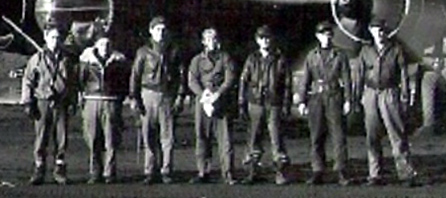The men in the picture are, left to right, 1st LT Walter Wagner-squadron navigator, 2nd LT Leonard Moore-co pilot, Capt. Warren Beth-pilot & flight leader, 1st LT Bailey-bombardier, SSGT Leonard Hawk-gunner, SSGT Stewart-ground crew chief, TSGT Stephens-radio operator. Picture was taken after the flight returned to base.