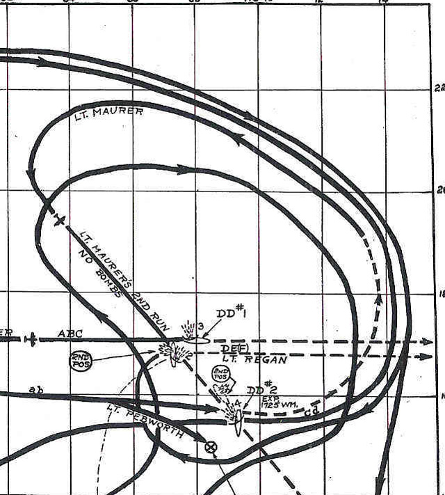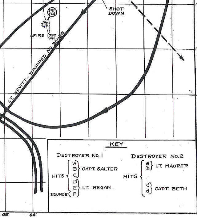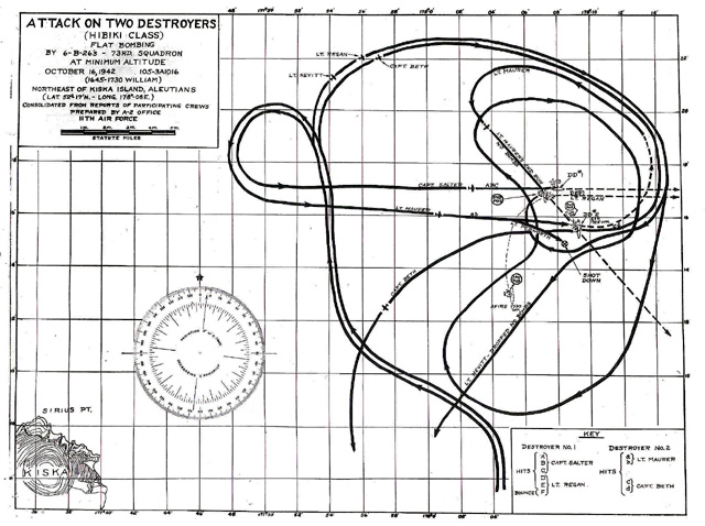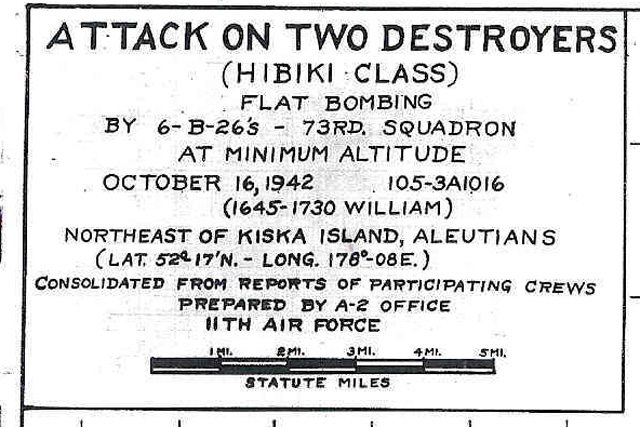 The crew of lead ship in a flight of six B26's that attacked the Hibiki class Japanese destroyers Oboro and Hatsuharu on October 16, 1942. One of the planes dropped out with engine trouble and one was shot down going in. The remaining four B26's made deck level bomb runs on the two ships with twenty 300 pound bombs with 4.5 second fuses. Direct hits were observed on both ships. The Oboro was sunk and the Hatsuharu was severely crippled.